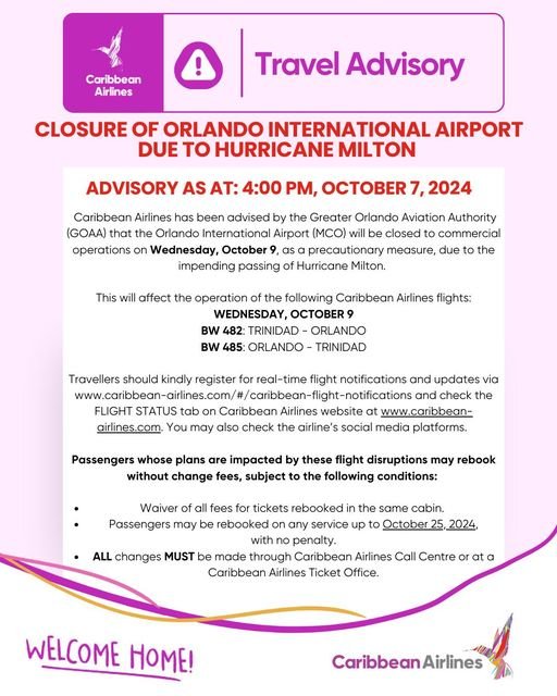 The Caribbean Airlines released the travel advisory regarding Orlando International Airport on October 7, 2024. The Caribbean airline has been advised by the Greater Orlando Aviation Authority (GOAA) that due to forthcoming Hurricane Milton, the Orlando International Airport will remain closed on Wednesday, October 9.